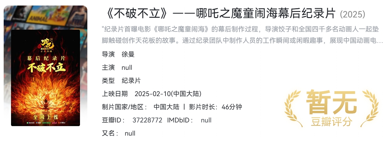 【不破不立—哪吒之魔童闹海幕后纪录片】(2025)【4K】简中字幕 【2.6G】 栏目:纪录片 作者:资源港 时间:2025-11-27 23:53:17   **剧情简介:** 纪录片首曝电影《哪吒之魔童闹海》的幕后制作过程,导演饺子和全国四千多名动画人一起垫脚触碰创作天花板的故事。通过纪录团队中制作人员的工作瞬间或闲暇趣事,展现中国动画电影人不断突破想象力、突破自我、突破极限的顽"强精神与乐观态度,及"人生不设限"的价值观。 > [!success] **资源链接** >https://pan.quark.cn/s/d06812fd75da 版权声明:本站不存储任何实质资源,该帖为发布的网盘链接介绍帖。如您认为本站任何介绍帖侵犯了您的合法版权,请联系站长 ( 微信:YBM036 ) 进行投诉,我们将在确认本文链接指向的资源存在侵权后,立即删除相关介绍帖子!