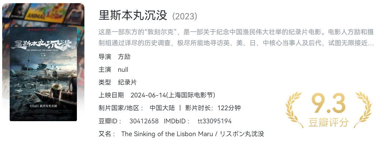 里斯本丸沉没 ( 2024 )( 4K+1080P )中字 豆瓣 9.3 强烈推荐的一部纪录片【 7.7GB 】 栏目:纪录片 作者:资源港 时间:2025-11-28 00:17:35   **剧情简介:** 这是一部东方的“敦刻尔克”,是一部关于纪念中国渔民伟大壮举的纪录片电影。电影人方励和摄制组通过详尽的历史调查,极尽所能地寻访英、美、日、中核心当事人及后代,试图无限接近中国舟山东极岛附近海底30米处的二战“死亡之船”——“里斯本丸”的沉船真相。 > [!success] **资源链接** >https://pan.quark.cn/s/7aa22e2169b9 版权声明:本站不存储任何实质资源,该帖为发布的网盘链接介绍帖。如您认为本站任何介绍帖侵犯了您的合法版权,请联系站长 ( 微信:YBM036 ) 进行投诉,我们将在确认本文链接指向的资源存在侵权后,立即删除相关介绍帖子!