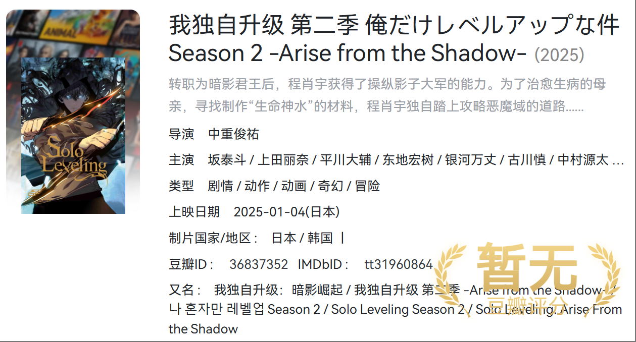 我独自升级 第二季 (2025) 4K超高码率 内嵌中文字幕 已完结(含第一季4K)共169G 栏目:动漫区 作者:资源港 时间:2025-12-03 00:35:40   **简介:** 讲述了实力弱小的E级猎魔者程肖宇在不断成长、蜕变和挑战升级的过程中,与其他猎人组队进入地下城,遭遇神秘房间巨大石像攻击,虽数次拯救队友但依旧损伤惨重,最后将逃跑机会让给朋友独自面对敌人,在生死存亡之际获得升级系统,开启向着“最强猎人”目标努力的故事。 > [!success] **资源链接** >https://pan.quark.cn/s/60c6aca7a616 版权声明:本站不存储任何实质资源,该帖为发布的网盘链接介绍帖。如您认为本站任何介绍帖侵犯了您的合法版权,请联系站长 ( 微信:YBM036 ) 进行投诉,我们将在确认本文链接指向的资源存在侵权后,立即删除相关介绍帖子!